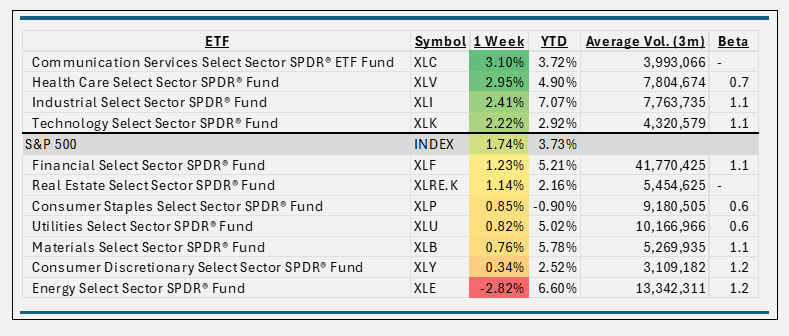 - Ten of the eleven GICS sectors within the S&P were winners this week, with four sectors beating the broad market S&P500 return, as noted above.