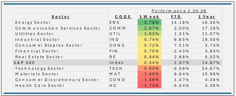 - Communication Services advanced about 2.7% last week, supported by strong mega cap earnings and a constructive backdrop for digital advertising and streaming demand. Within the Communication Services Sector, gains were led by its largest holdings—Meta Platforms, Alphabet, and Netflix—which responded positively to robust fourth quarter results and guidance highlighting resilient ad budgets, user engagement, and new AI driven monetization initiatives. Telecom and cable constituents, including Comcast and T Mobile, added to the move as investors focused on steady subscriber trends and improving free cash flow profiles.