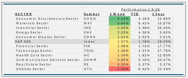 - The S&P 500 advanced 1.6% for the week ending 1/9/26, as markets responded positively to a combination of easing inflation signals, stabilizing interest rates, and renewed confidence in earnings growth. Softer economic data reinforced expectations that the Federal Reserve can remain on hold, keeping financial conditions supportive for risk assets. Leadership expanded beyond mega-cap technology into cyclicals and financials, reflecting improving risk sentiment and optimism that the economy can achieve a soft landing without a material slowdown in growth.