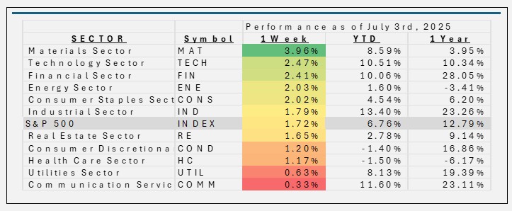- As Americans prepared to celebrate Independence Day, equity markets delivered a fitting display of resilience and optimism. The S&P 500 notched a 1.7% gain, closing at record highs and reflecting the nation’s enduring economic strength. Sector leadership was broad, with materials, technology, and communication services all posting robust advances ahead of the Fourth of July holiday.