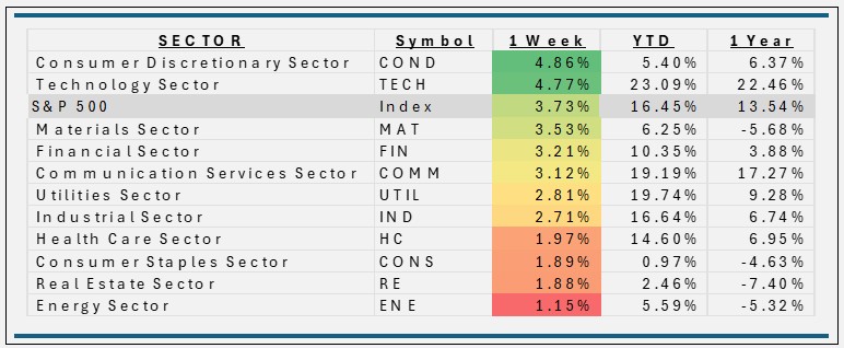 - For the week ending 11/25/25, the Consumer Discretionary gained about 4.9%, driven primarily by strong holiday-shopping optimism, upbeat early Black Friday data, and a rebound in key mega-cap discretionary names such as Amazon (+5.47%) and Tesla (+10.0%), along with Home Depot (+3.9%). During Thanksgiving week, stocks tied to online retail, travel, and leisure were supported by record e commerce volumes, strong demand for big-ticket electronics and home goods, and robust travel and dining activity.