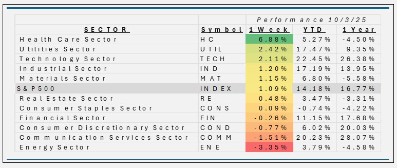 - The S&P 500 advanced 1% for the week ending October 3, 2025, but it was the healthcare sector that stole the show, and clearly ate its protein this week, surging an eye-popping 6.9%. Utilities also brought some spark to portfolios, adding 2.4%. Despite the potential impact of a U.S. government shutdown, investors took the uncertainty in stride, with markets betting that any disruptions would be temporary and unlikely to derail economic momentum. The impact was more psychological, and stocks rallied as the week wore on.