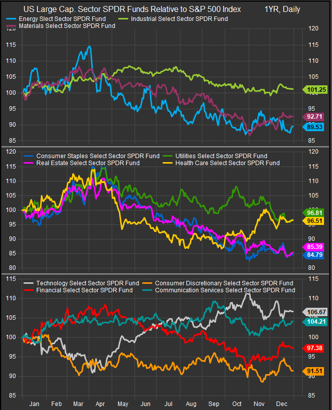 Inflation dynamics played a central role in shaping relative sector returns. Goods inflation cooled meaningfully in 2025 as supply chains normalized and inventory overhangs cleared, while services inflation—particularly housing- and labor-related—proved stickier. Core inflation trended lower over the year, but progress was uneven, keeping policy uncertainty elevated. This environment benefited long-duration growth sectors, especially those tied to productivity and automation, while weighing on rate-sensitive defensives such as Utilities and Real Estate. Periodic rebounds in energy and industrial metals prices reintroduced inflation tail risk late in the year, briefly supporting Energy and Materials, though neither sector sustained leadership without confirmation of a broader inflation re-acceleration.