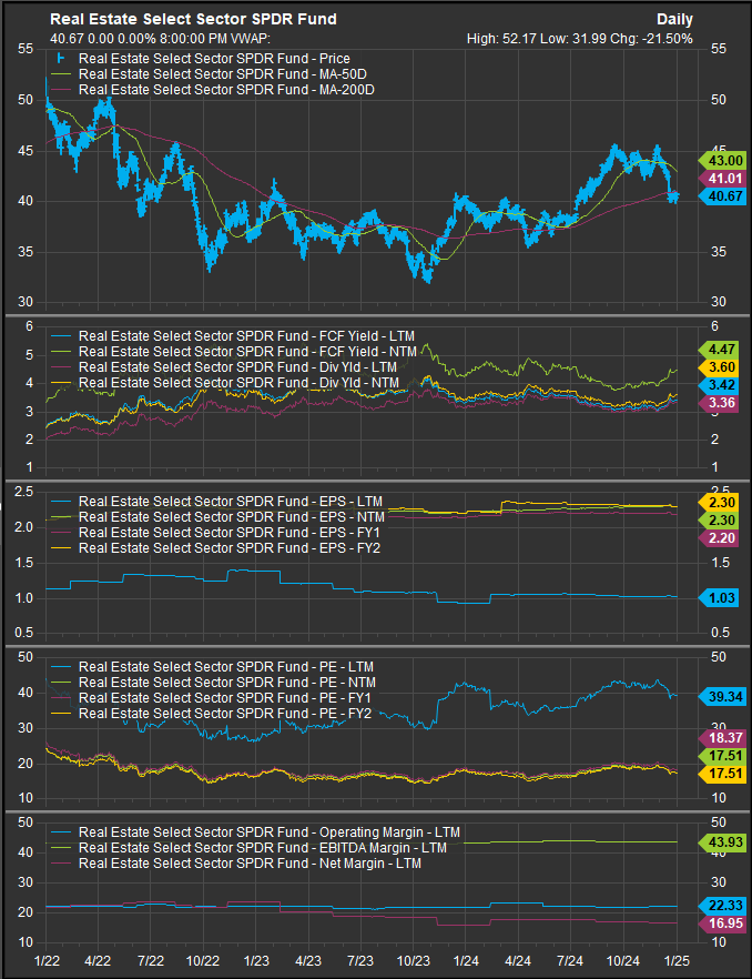 The chart below shows S&P 500 Real Estate Sector FCF yield, and Dividend Yield as well as projected earnings over the next 3 years, valuation and trailing margins. Consensus forecasts continue to project significant EPS growth over the next 3 years, but given the pace of earnings in 2024, that seems complacent at this point. Present valuations given the collapse in present year earnings remain elevated relative to the broad market. A lot relies on the fundamentals going right. We are skeptical due to high rates and a sluggish “back to the office” dynamic. We remain convinced that much existing Office and Commercial Real Estate needs to be repurposed to residential, which would take a significant amount of investment. This is only going to be a boon if financing costs come in.