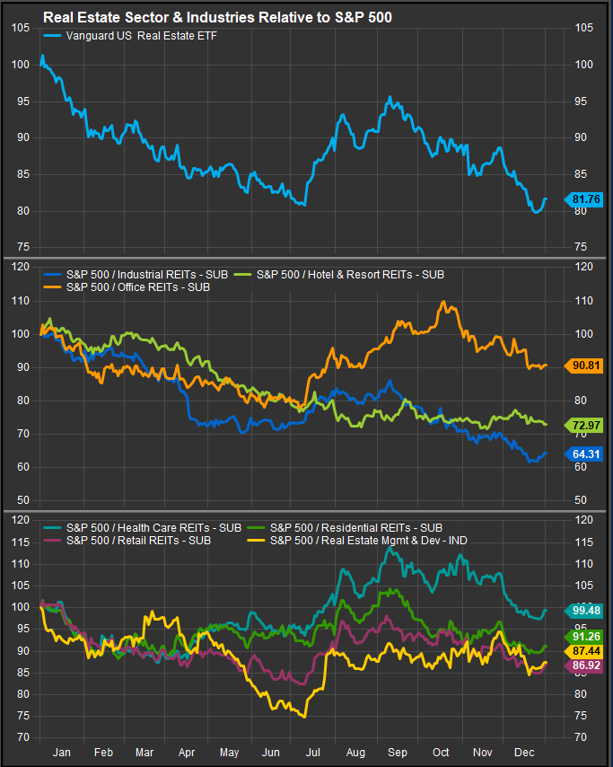 With the sector selling off in the 2nd half of 2024, none of its industries was able to outperform over the 12-month period. Healthcare REITs were the best performers, but weakness in Q4 was pervasive.