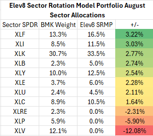 ETFsector has created the Elev8 Sector Selection Portfolio as a framework for establishing a differentiated monthly view vs. our S&P 500 benchmark. Our starting weights for August are as follows: