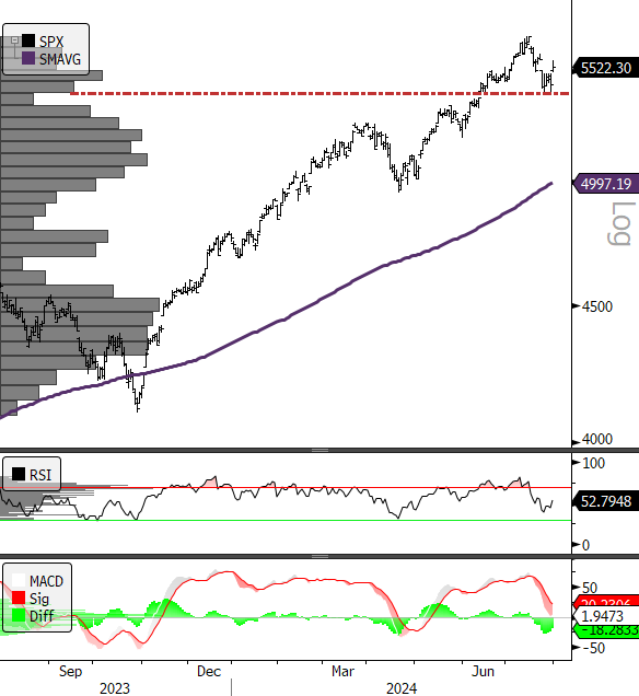 The S&P 500 traded to an all-time high of 5667 on July 16, 2024. It ends the month with an approximately 5% correction, and a sharp rotation away from Mega Cap. Growth Leadership and into a broad array of YTD laggard sectors. There were plenty to choose from as only the Tech. and Comm. Services Sector had outperformed the S&P 500 Index through the middle of July. As we end the month of July, the S&P 500 persists in a long-term uptrend price structure. Notably, it enters the seasonally weak period from August through mid-October which this year will transpire against the backdrop of a likely bitter presidential election. We expect rotation away from Mag7 stocks to continue to be a theme in August as investors take profits, but we would expect them to come back in favor again before the end of the year.