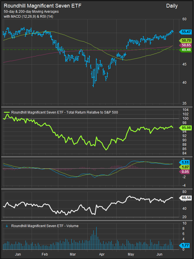 The first leg of the present long term bull trend kicked off in early 2023. With the present realignment and global trade playing out we Notice mag 7 stocks are improving in aggregate, but they are not leading the tape in the near term (chart below). For the past six weeks these mega cap growth names have been treading water in aggregate as several members of the cohort (AAPL, GOOGL and TSLA) Have faced an overhang of selling pressure. While five of the seven constituents remain buy rated in our technical process, buyer behavior regarding this group of stocks has clearly changed. You think this opens the door for other high beta opportunities and we expect the leadership profile of the US equity market will broaden out concurrent with the continued bull trend.