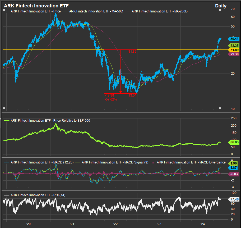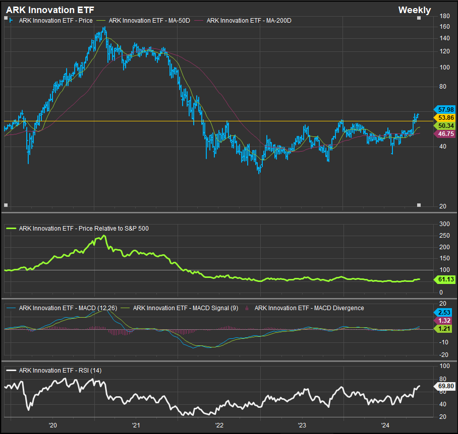 In today’s report, we want to highlight the constructive technical setup we are seeing in the ARK ETFs. Most have not forgotten the excellent performance of Kathy Wood’s funds in 2020, nor the rapid fall from grace in early 2022, but the ARK Fintech Innovation ETF has been a steady outperformer in this bull market and the ARK Innovation ETF is just starting to show signs of life that look attractive to us.