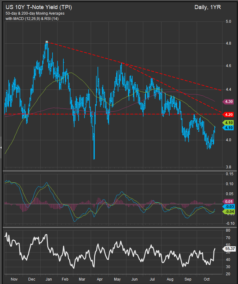 We want to use the direction of interest rates as guide for how we position around Technology in our portfolio.  If rates stay contained below 4.2% we would hedge a potential tech correction with lower vol. sector positions (XLV, XLU, XLP) while if rates moved higher we’d want to move into sectors that are potential inflation beneficiaries (XLI, XLF, XLB, XLE).