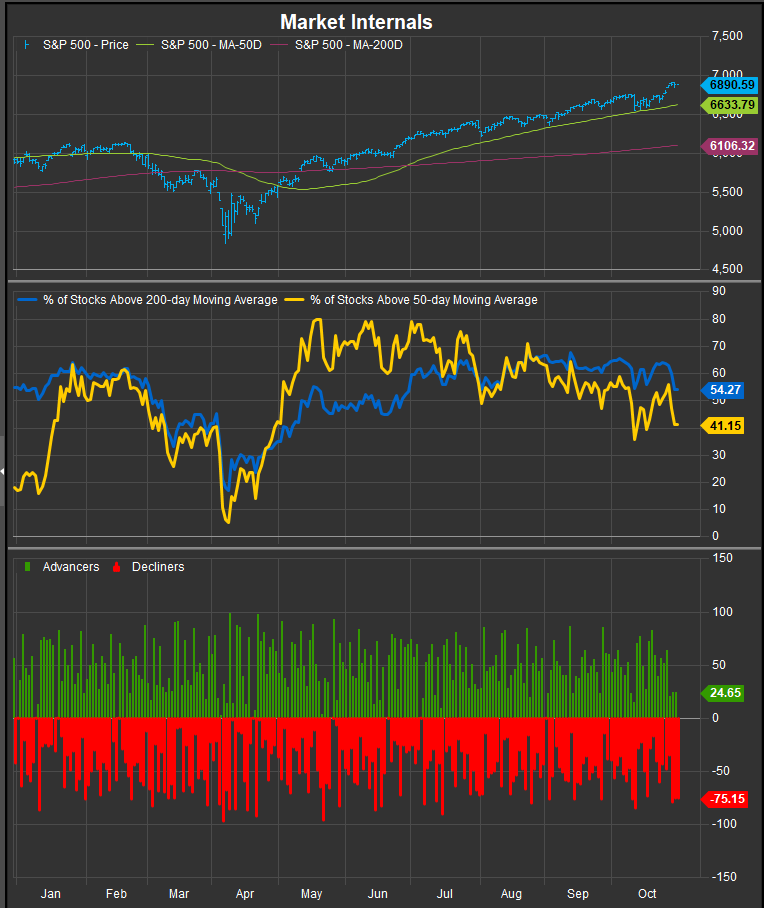 While it is clear that there is widespread speculative enthusiasm for Technology/AI exposures and crowding is a risk, there is also the fact that speculative excess offers an opportunity to make a lot of money in the stock market.  While the macro picture remains favorable (low rates, tame inflation), we recommend maintaining at least a market weight position in Technology shares.  We believe the direction of interest rates (chart below) is an important “tell” for anticipating rotation.  Structural risks to the AI trade fall into two broad buckets, inflation risk and recession risk.  Given the position of the 10yr yield we think 4.2%-4.4% is a key zone of transition.  Above 4.4% there’s less congestion and rates would likely begin to re-exert pressure on the consumer and the credit cycle.