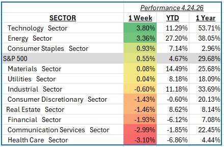 The S&P 500 posted a modest gain of 0.55% for the week ending April 24, 2026, reflecting a market that continues to grind higher despite mixed macro signals. Investors balanced resilient corporate earnings with ongoing uncertainty around interest rate policy and global growth. Key highlights included stronger-than-expected results from large-cap technology companies, stabilization in energy prices, and softer economic data that reinforced expectations for a more patient Federal Reserve stance.