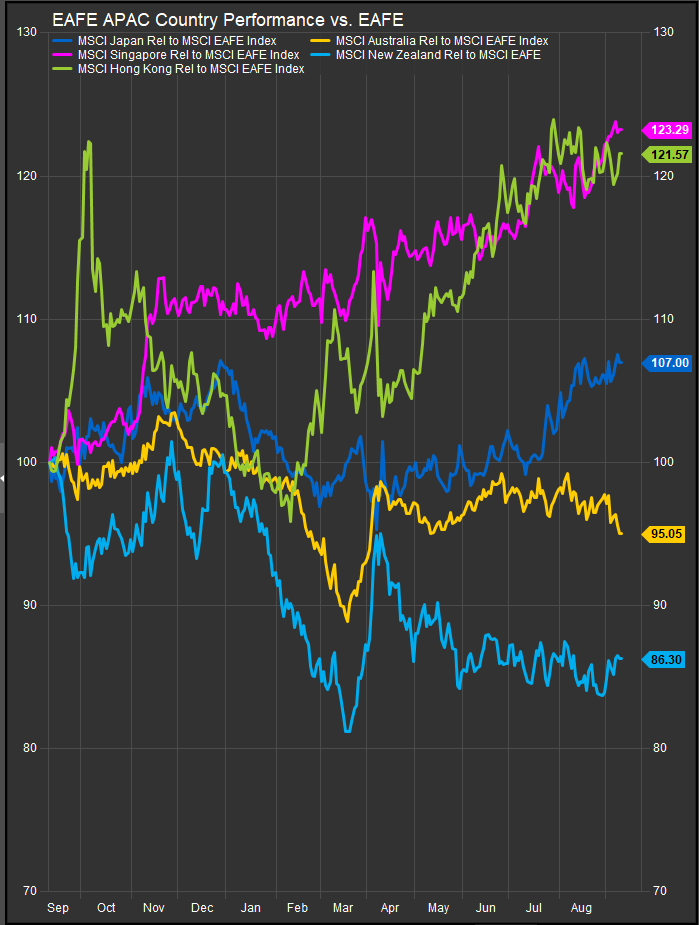Developed market equities have persistently had trouble keeping pace when AI stocks lead as the European Tech Sector is notably small relative to its US and EM counterparts.  We can see the results of this in country level performance.  Leadership has shifted dramatically away from core Europe, particularly out of German equities, and towards DM Asian geographies.  Japan, Hong Kong and Singapore have been leadership (charts below).
