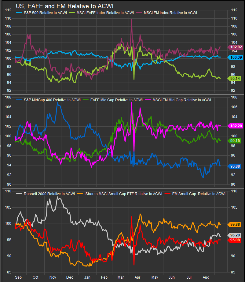 In our last Worldwide Wednesday column on August 6, we remarked that some deterioration in US stock market breadth (upside participation at the stock level) was weakening and some continued rotation into ex-US exposures was likely.  That dynamic shifted rather quickly as Fed chairman Powell came out with clear dovish remarks at Jackson Hole, WY on August 20th.  Expectation of policy easing in the US firmed domestic shares and halted the nascent bullish reversal in EAFE shares (chart below, top panel); however, we note EM equities continue to act well.