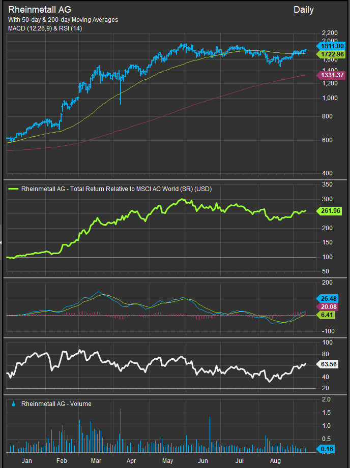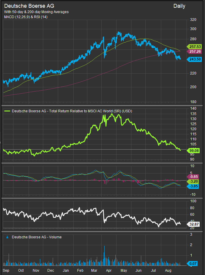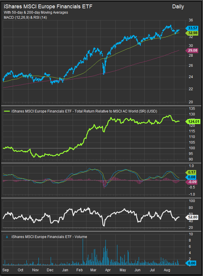 Central themes that had boosted European equities revolve around the rubric “Banks & Tanks”, and that theme has slowed in the near-term.  Leading defense manufacturer Rheinmetall AG (RHM-ETR) has consolidated sideways.  The biggest banks remain strong, though other financials which had been riding high with the banking trade are in retracement.  We highlight Deutsche Boerse AG (DB1-ETR) as a prominent example.  The result has been that EU financials have leveled off, and while we’re still constructive on the trade over the longer-term, EAFE equities are likely to lag without strong tailwinds from these sectors (charts below).