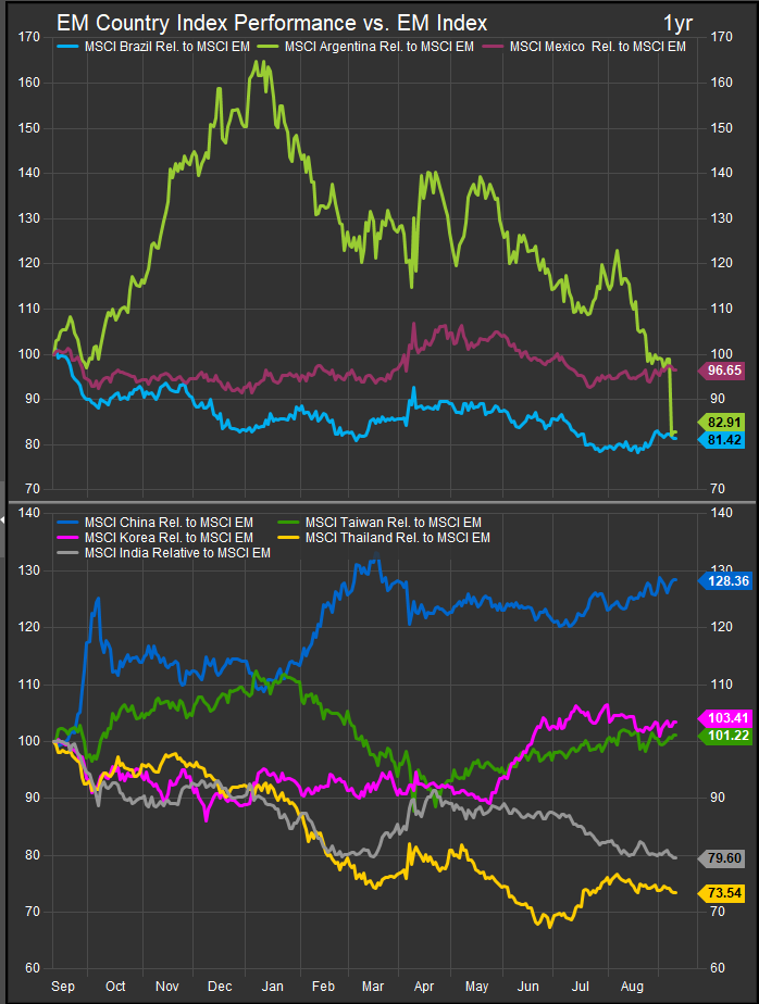 EM Tech, particularly in Asian geographies has been a standout theme as disaggregation of the global supply chain has created growth opportunities for a larger set of companies both within and outside the US political sphere of influence.  Long dominated by stocks like Tencent, Alibaba and TSMC, there are a new wave of high momentum tech stocks benefitting from continued AI enthusiasm.  When looking at country level performance of EM majors, China, Taiwan and South Korea continue to be leadership (chart below).