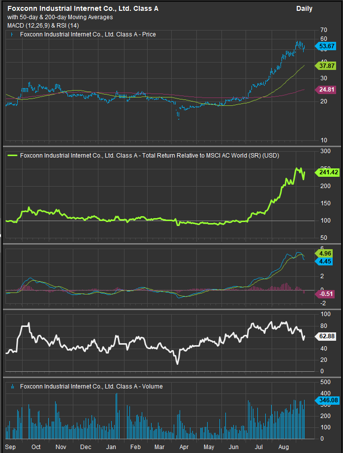 At the stock level, the intermediate-term momentum in established and emerging Tech names has been impressive.  Both Taiwan Semi and Foxconn (China) Industrial Internet (6011138-SHG) have taken off, with the former breaking out decisively to new highs from an intermediate-term bullish reversal and the latter on a momentum surge from early June (charts below).  In addition, stocks like Wiwynn Corp. (6669-TAI), a Taiwanese hyperscaler, have emerged in strong long-term trends.  Hyperscalers are the cloud, datacenter and IT infrastructure companies that enable large scale AI implementation (think MSFT, Amazon AWS, Google, META in the US).